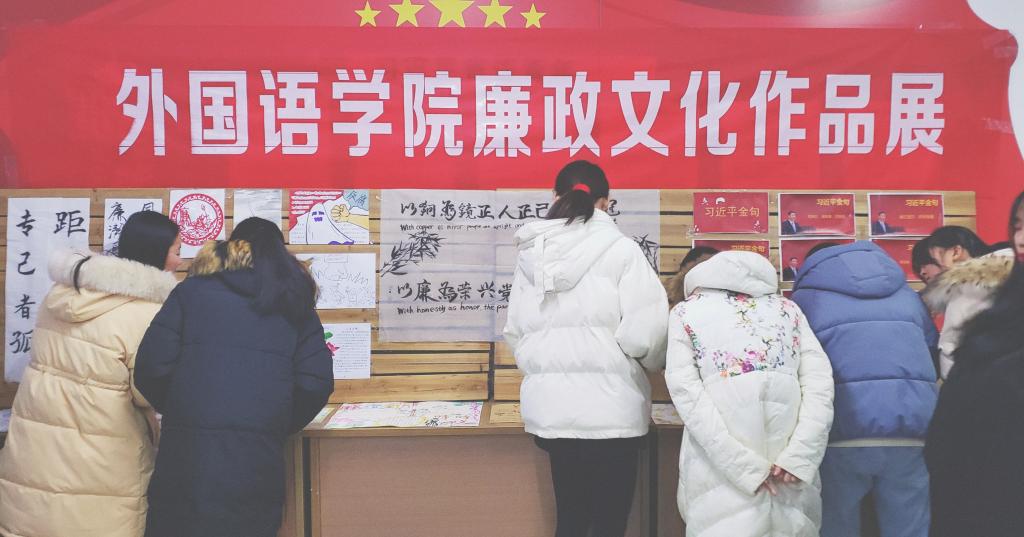 为进一步加强校园廉政文化建设,深化党风廉政教育,外国语学院党总支于2019年12月20日下午在学生公寓二栋新时代中心开展了第四届廉政文化作品展活动。学院党总支书记朱代洪、分团委书记王聪及各班学生代表参与了此次廉政文化作品展。