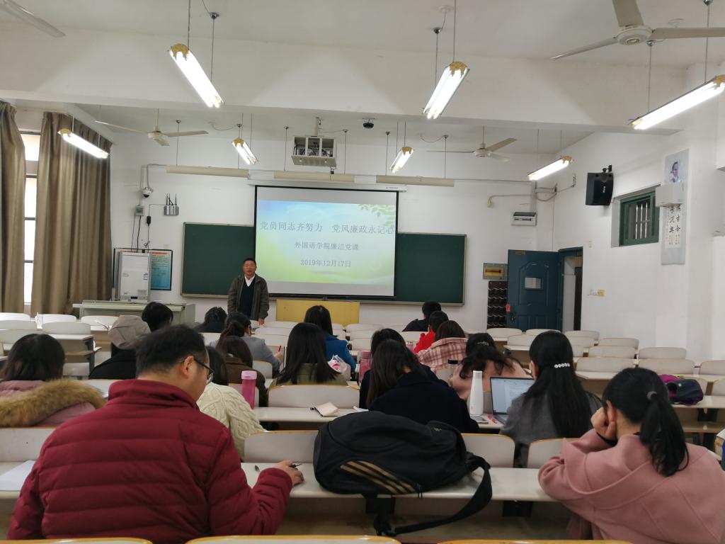 在“不忘初心、牢记使命”主题教育深入开展之际,12月17日,外国语学院党总支书记朱代洪,给全体教师党员讲授了题为“党员同志齐努力,党风廉政永记心”的专题廉洁党课。