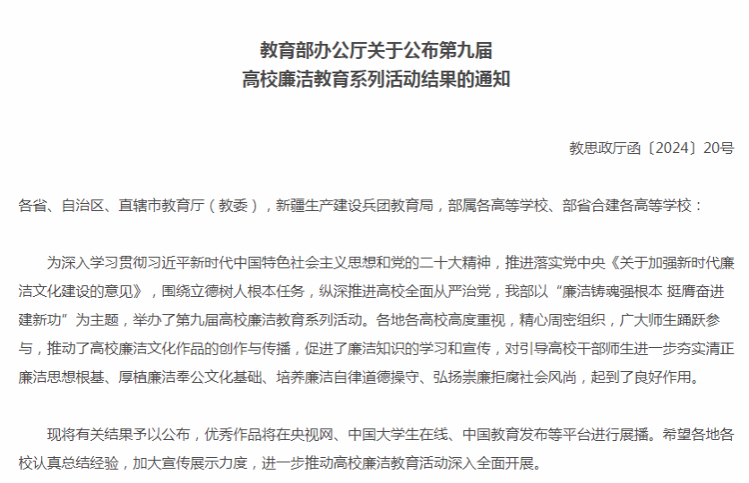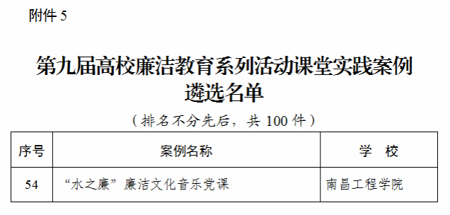 近日,教育部公布了第九届高校廉洁教育系列活动结果,我校选送的作品《“水之廉”廉洁文化音乐党课》入选第九届高校廉洁教育系列活动课堂实践案例遴选名单(全国100个,江西3个)。